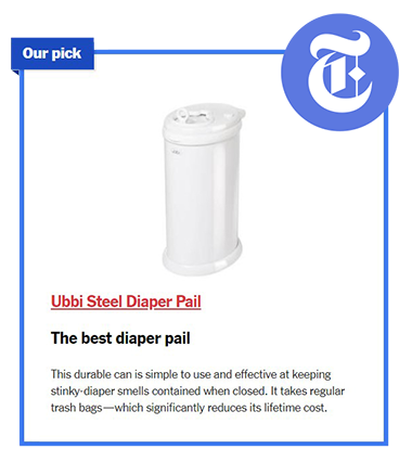 Namenski koš za plenice lahko olajša vsakodnevno – včasih vsakourno – menjavo dojenčkove plenice in lahko pomaga prikriti smrad pleničk. New York Times je po raziskavi 15 košev za plenice in testiranju devetih finalistov v več tednih, ko so tri družine med njimi zabeležile skoraj 250 zamenjav plenic, ugotovil, da Ubbi koš za plenice ponuja najboljše ravnovesje med nadzorom neprijetnih vonjav in enostavnostjo uporabe ter ga tako označil za najboljši koš za plenice leta 2023!